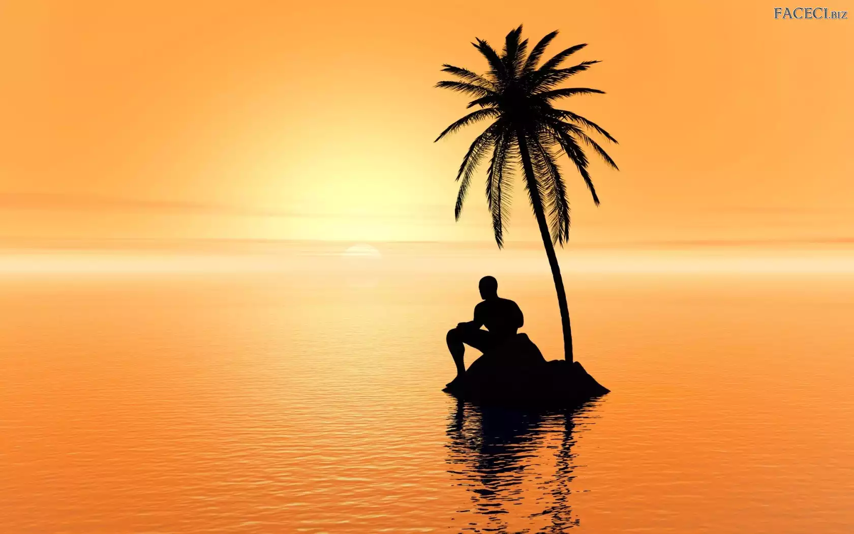 Mężczyzna, Morze, Słońca, Zachód, Wysepka, Palma - faceci.biz